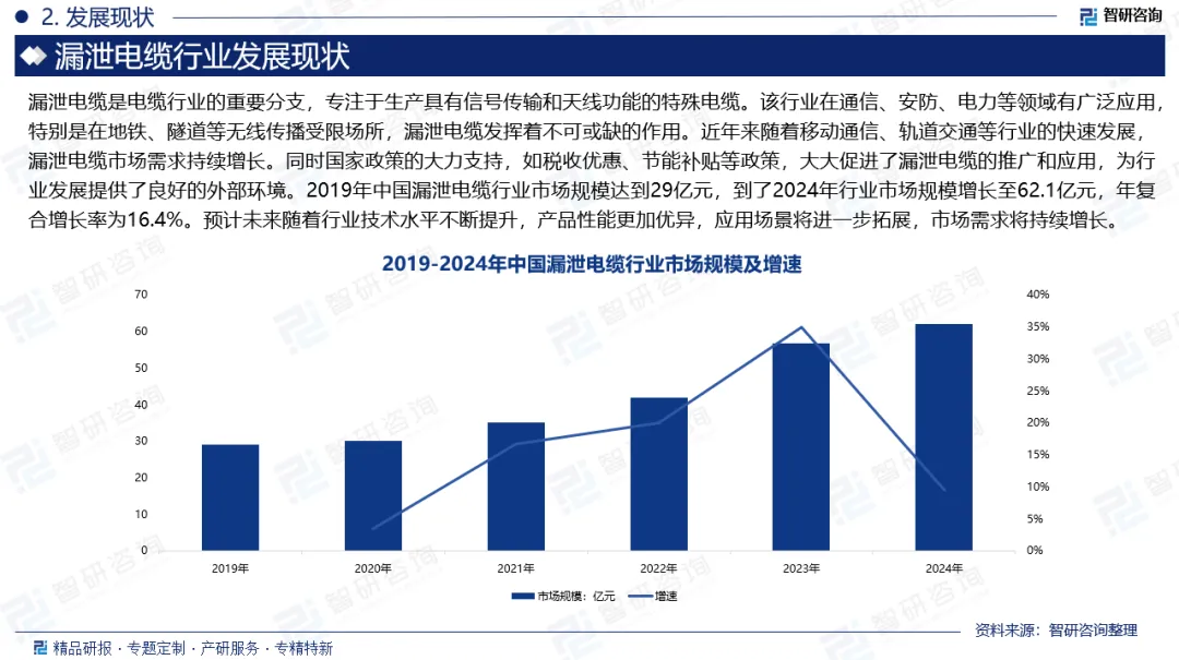 漏泄电缆,又称漏泄同轴电缆、泄漏电缆或漏缆,是一种在外导体周期性开槽的同轴通信电缆,兼具电磁波传输与辐射功能。漏泄电缆是电缆行业的重要分支,专注于生产具有信号传输和天线功能的特殊电缆。该行业在通信、安防、电力等领域有广泛应用,特别是在地铁、隧道等无线传播受限场所,漏泄电缆发挥着不可或缺的作用。近年来随着移动通信、轨道交通等行业的快速发展,漏泄电缆市场需求持续增长。同时国家政策的大力支持,如税收优惠、节能补贴等政策,大大促进了漏泄电缆的推广和应用,为行业发展提供了良好的外部环境。2019年中国漏泄电缆行业市场规模达到29亿元,到了2024年行业市场规模增长至62.1亿元,年复合增长率为16.4%。预计未来随着行业技术水平不断提升,产品性能更加优异,应用场景将进一步拓展,市场需求将持续增长。