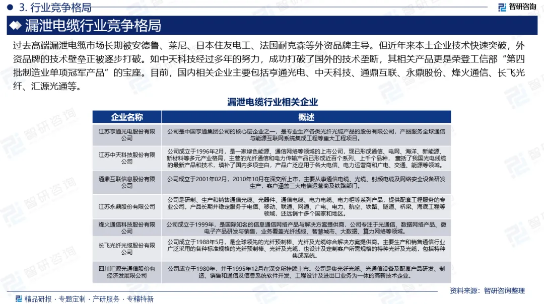 企业格局:过去高端漏泄电缆市场长期被安德鲁、莱尼、日本住友电工、法国耐克森等外资品牌主导。但近年来本土企业技术快速突破,外资品牌的技术壁垒正被逐步打破。如中天科技经过多年的努力,成功打破了国外的技术垄断,其相关产品更是荣登工信部“第四批制造业单项冠军产品”的宝座。目前,国内相关企业主要包括亨通光电、中天科技、通鼎互联、永鼎股份、烽火通信、长飞光纤、汇源光通等。