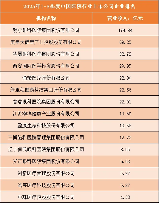 2025年1-3季度,医院行业上市公司的头部格局高度集中:爱尔眼科以174.84亿元营收稳居榜首,远超第二名美年健康(69.25亿元),形成明显的“第一梯队断层”。作为眼科专科连锁的龙头,爱尔眼科依托全国性的门店网络布局、标准化的诊疗服务体系,在民营眼科医疗领域占据绝对主导地位,规模效应不仅降低了运营成本,也强化了品牌影响力与患者粘性,构建起难以撼动的竞争壁垒。