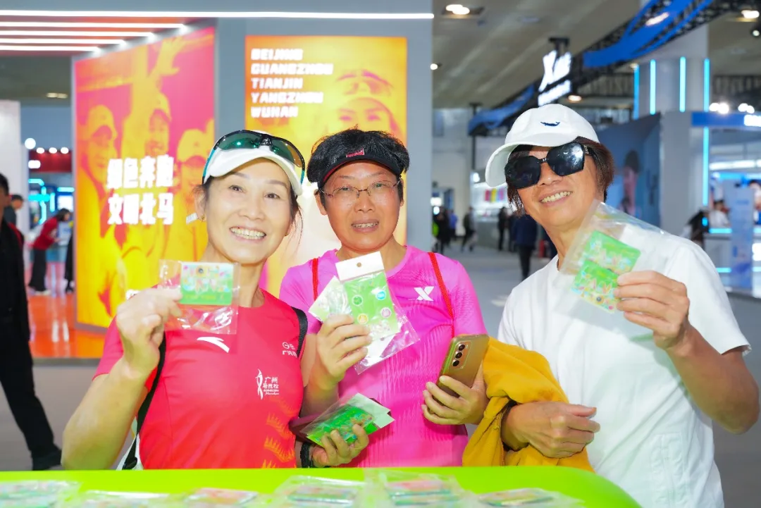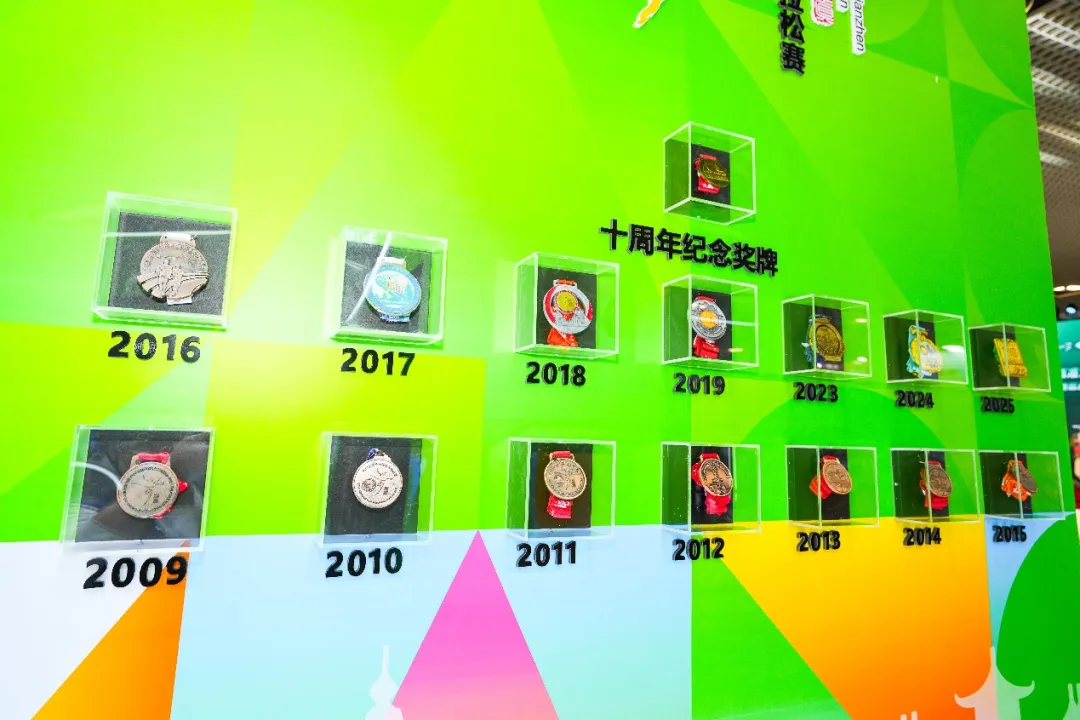展位现场还陈列了办赛历史与历届比赛奖牌,搭配展示了“扬马”办赛与城市宣传视频。现场通过小红书打卡与游戏互动等环节,吸引众多跑友前来关注。