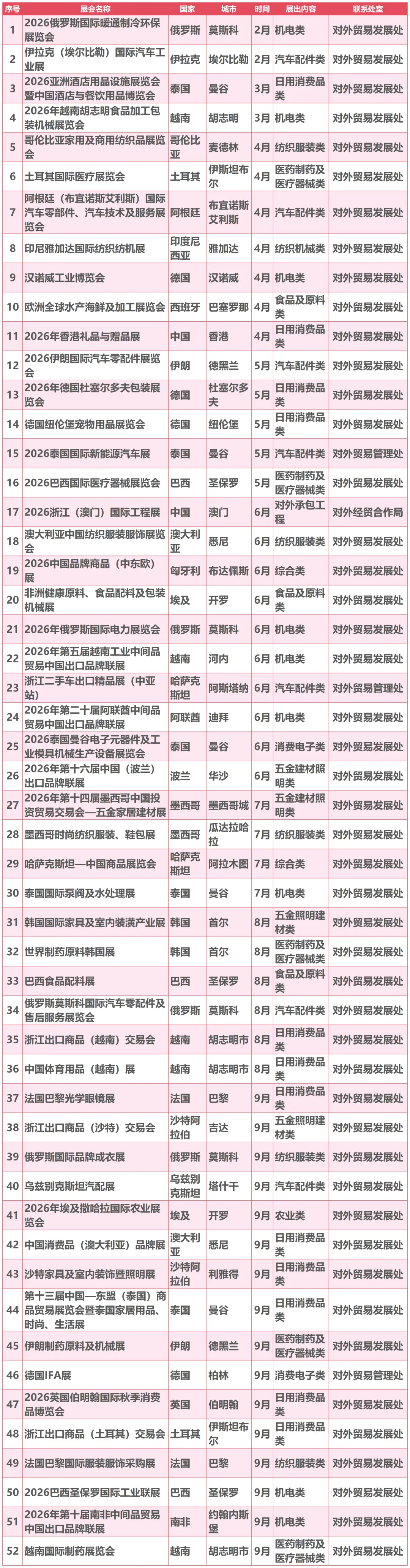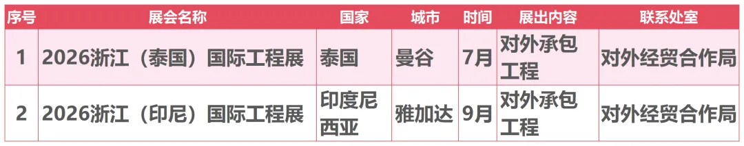 为推进高水平对外开放,建设高能级开放强省,发挥好展会拓市场、增订单积极作用,浙江省商务厅会同各市及相关单位研究确定了2026年度第一批商务展会目录,2026年前三季度拟重点举办和支持的展会项目共294个,本期将重点介绍自办类展会和重点类展会。