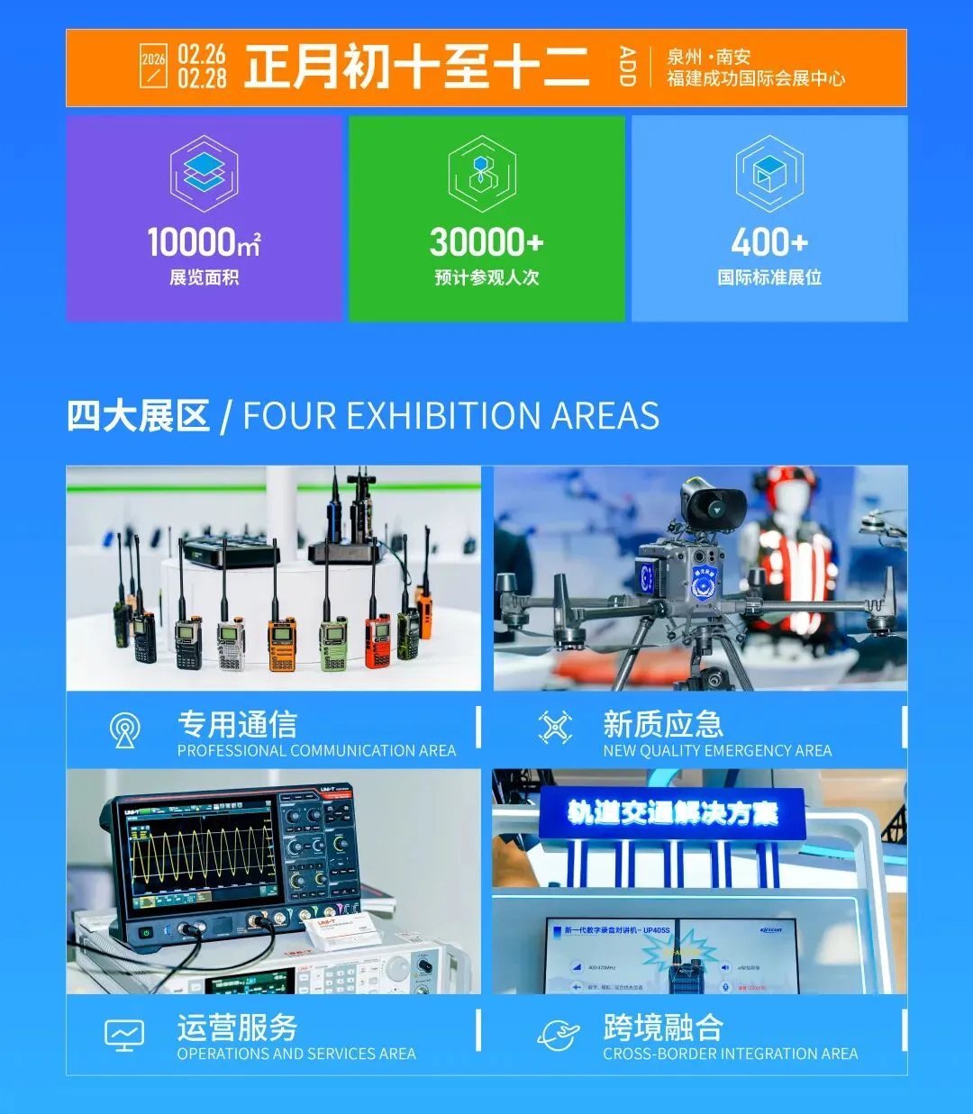 2026中国(泉州)专用通信暨应急产业博览会 以“创新互联,新质机遇”为主题,专注专用通信与应急产业,规划展出面积10000平方米,国际标准展位400余个,通过“展”、“会”及“系列活动”,搭建一个集展览展示、交流研讨和商务洽谈于一体的生态链平台,助力泉州南安围绕“四链融合”,从 “对讲机之乡”向“国际对讲机供应链集散中心”升级。