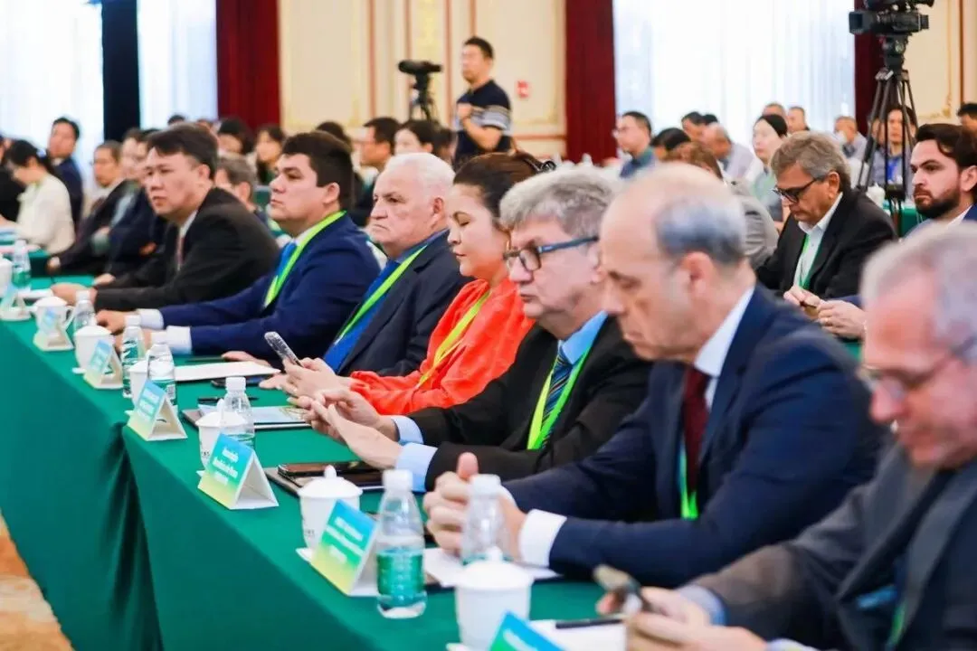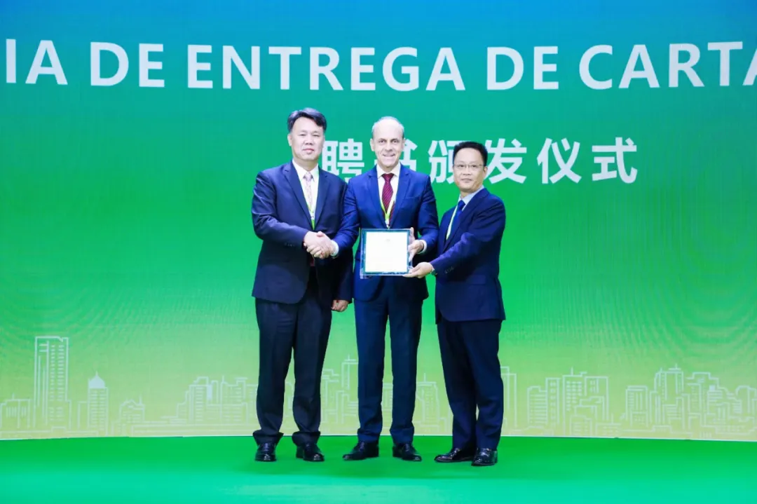 平台发起人为巴西牛肉工业及公司联合会主席爱德华(中)颁发荣誉理事长聘书。