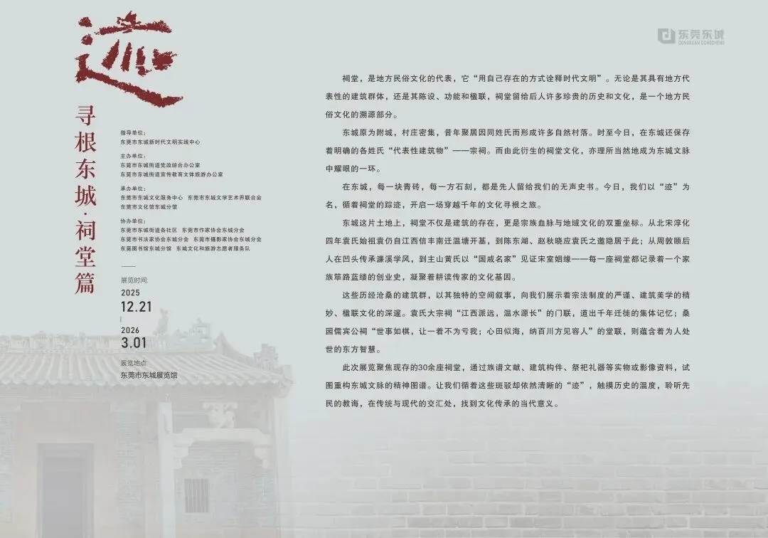 “迹——寻根东城▪祠堂篇”展览以祠堂为载体,深入梳理东城街道30余座祠堂的历史脉络与文化内涵,通过楹联、族谱、建筑遗存与人物故事,展现祠堂作为家族记忆、乡土教育与文化传承空间的多重意义,唤起公众对地方文脉的关注与思考。
