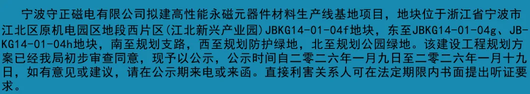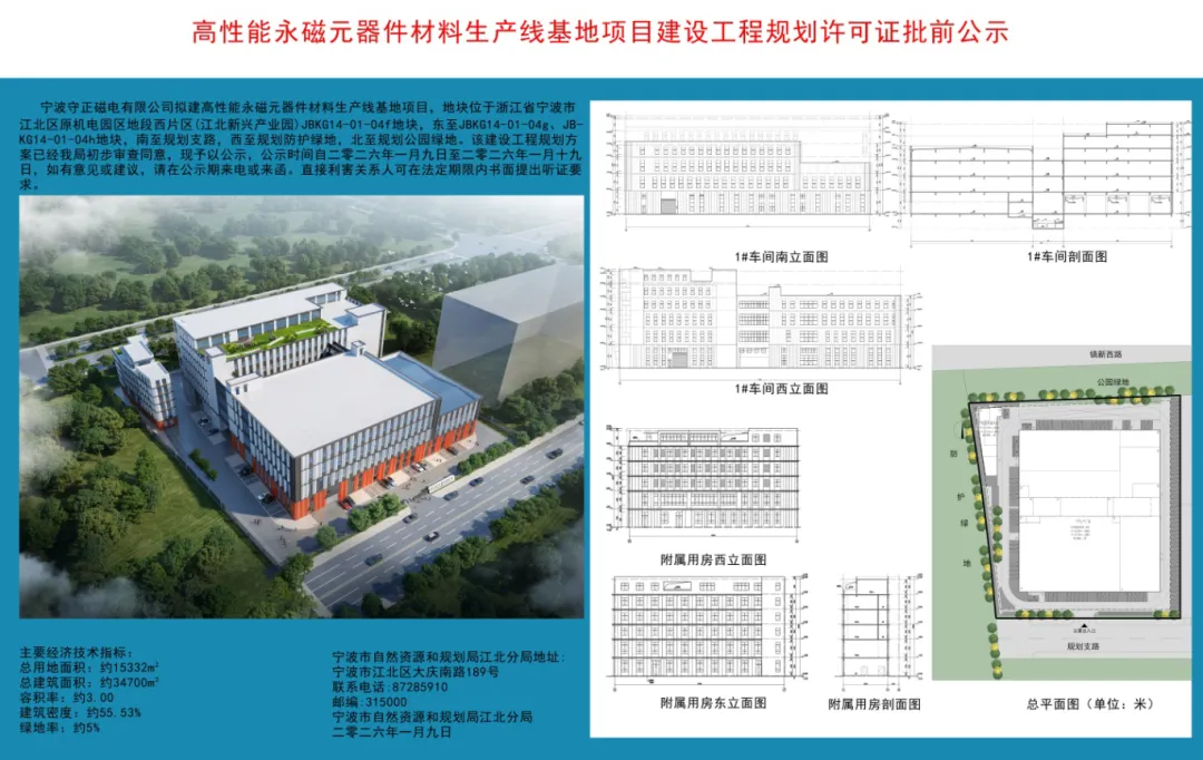 方案公示 | 宁波高性能永磁元器件材料生产线基地项目建设工程规划许可证批前公示2026.1.9