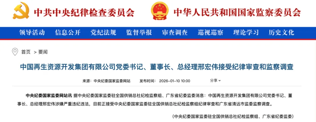 此前,2025年12月20日,中国再生资源集团全资控股的中再资源环境股份有限公司(中再资环,600217)发布公告称,公司董事会于2025年12月19日收到公司董事长邢宏伟递交的书面辞职报告,邢宏伟因个人原因申请辞去公司第八届董事会董事长、董事、董事会战略委员会主任委员和委员及薪酬与考核委员会委员等职务,同时不再担任公司法定代表人。离任后,邢宏伟不再担任公司任何职务。