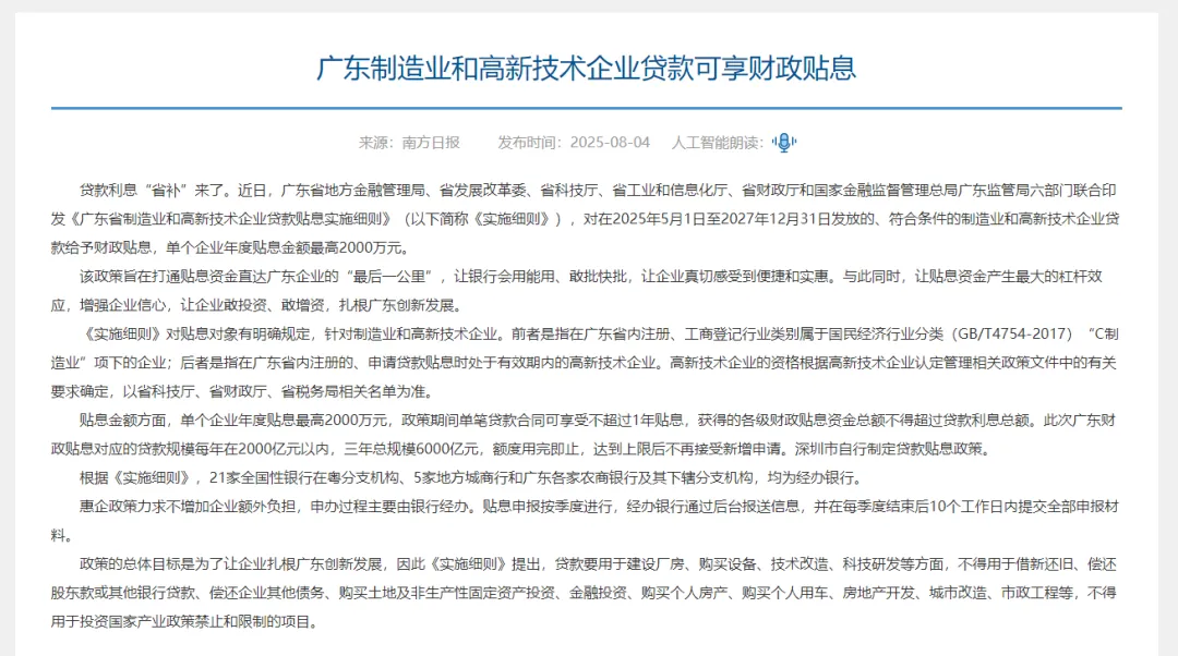 2025年8月,广东出台《广东省制造业和高新技术企业贷款贴息实施细则》,将政策延续到2027年底。与此类似的,十堰市提高了高新技术企业的贷款额度上限,淮安市将支持范围扩大至种子期和初创期科技企业。