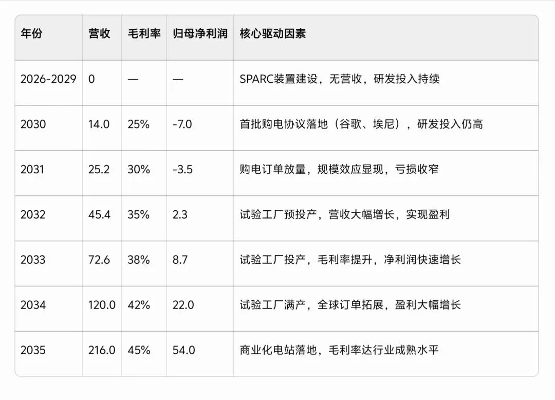 2. CFS专属假设:2027年SPARC装置能量增益≥10;2034年试验工厂投产;2030年起年营收复合增速(CAGR)达80%;毛利率逐步从2030年的25%提升至2035年的45%(规模效应+技术壁垒)。