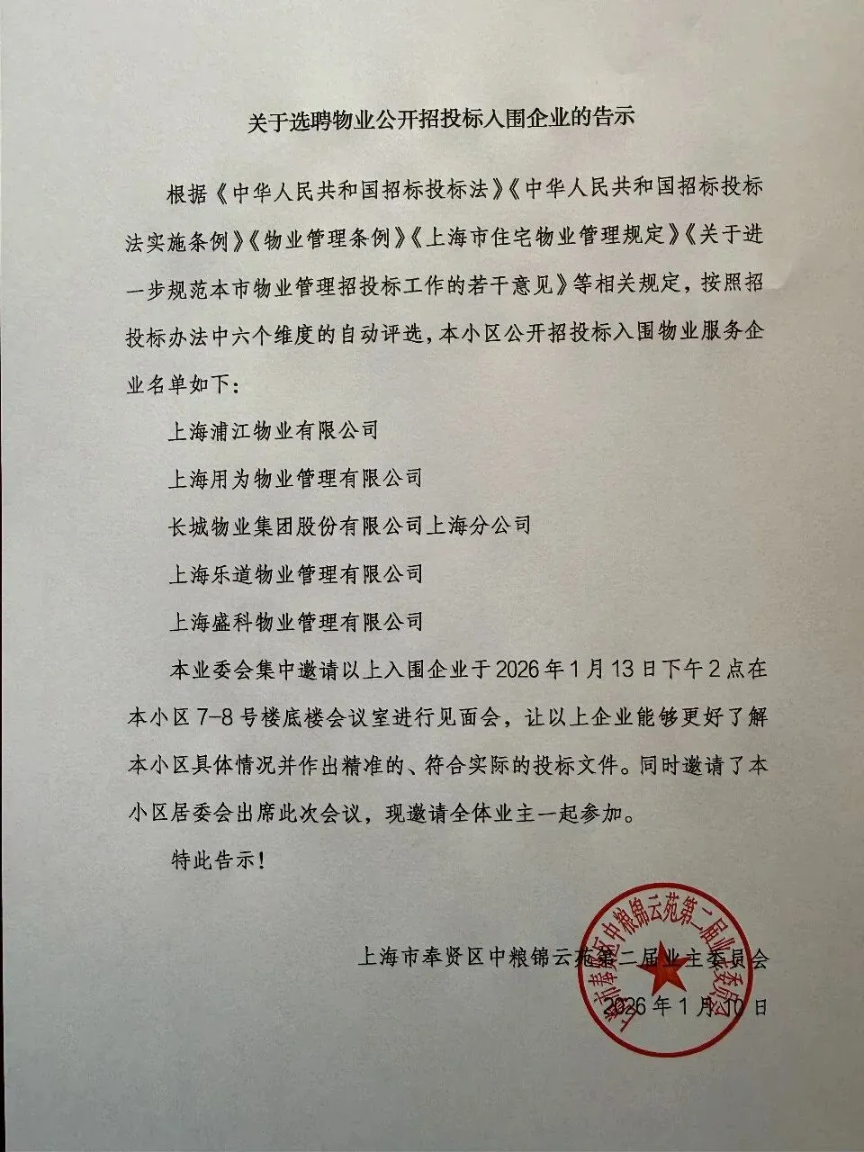 关于选聘物业公开招投标入围企业的告示
