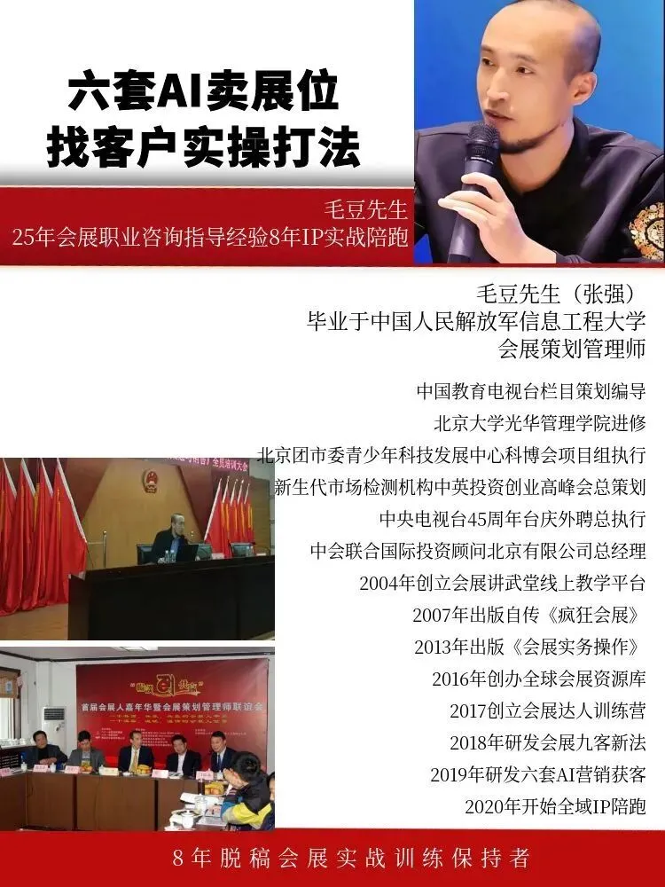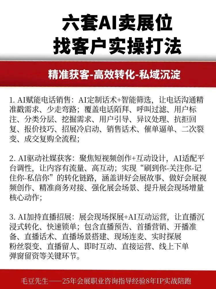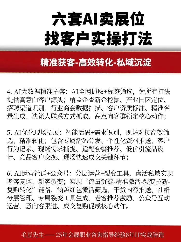 小白认知:比如把私域里的客户分成“想参展的新手企业”“需要升级展台的老参展商”“找搭建团队的展会主办方”,新手推基础的展位预订+简易搭建套餐,老参展商推高端展台制作升级服务,主办方推全馆的搭建总包方案,这样分类后转化更精准,招展和搭建的订单转化率能提升不少。