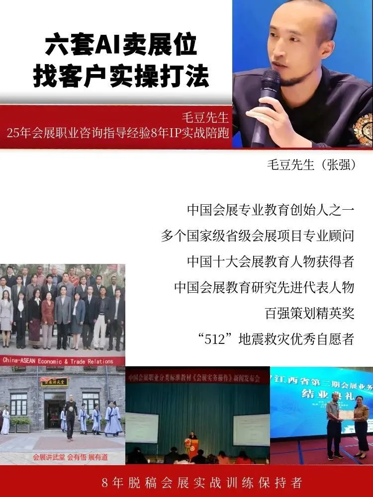 小白认知:不用怕AI工具复杂,比如用AI绘画生成“会展搭建师”的卡通IP形象,再用AI写人设文案,只需要输入“会展行业、十年搭建经验、擅长环保展台制作、高效招展”这些关键词,就能快速出结果;还能用AI生成展位设计的初步草图,新手也能快速给客户出参考方案,提升招展效率。