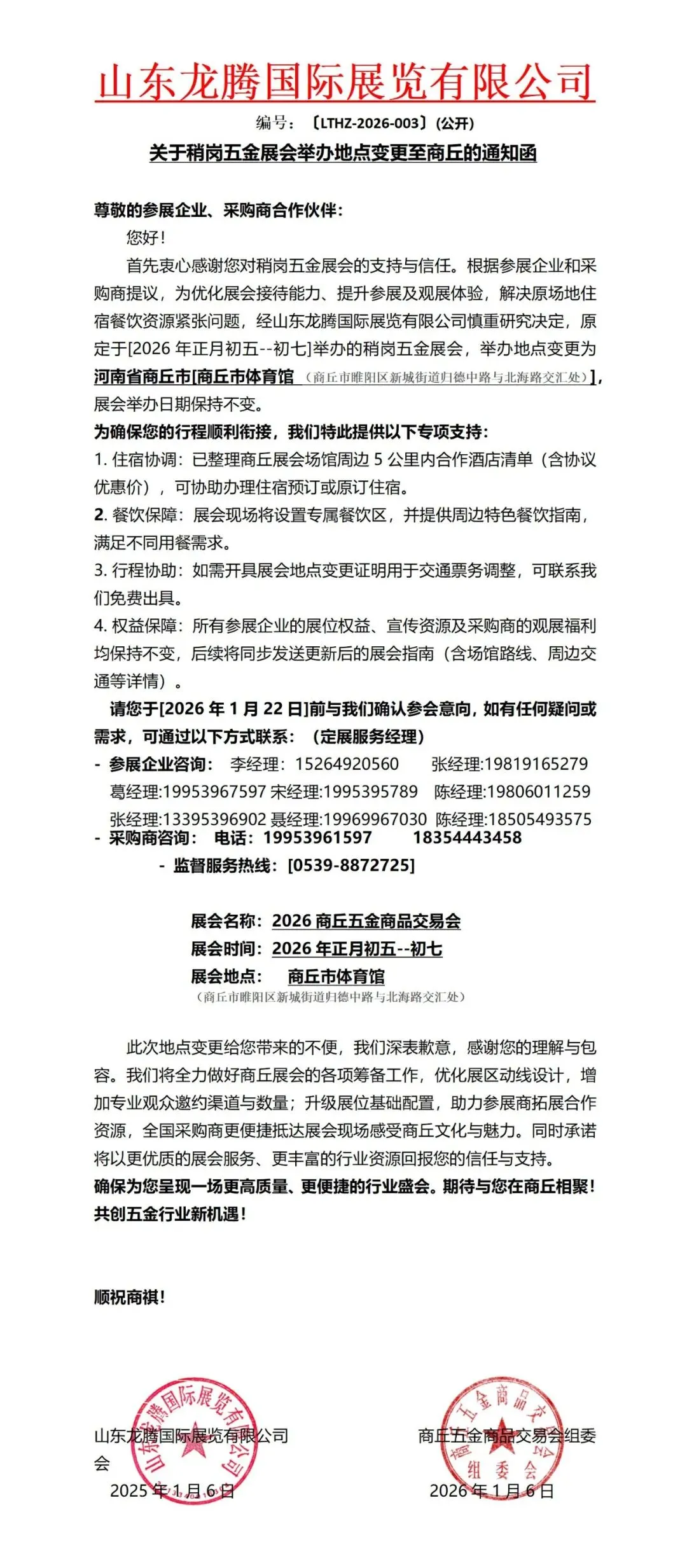 此次地点变更给您带来的不便,我们深表歉意,感谢您的理解与包容。我们将全力做好商丘展会的各项筹备工作,优化展区动线设计,增加专业观众邀约渠道与数量;升级展位基础配置,助力参展商拓展合作资源,全国采购商更便捷抵达展会现场感受商丘文化与魅力。同时承诺将以更优质的展会服务、更丰富的行业资源回报您的信任与支持。