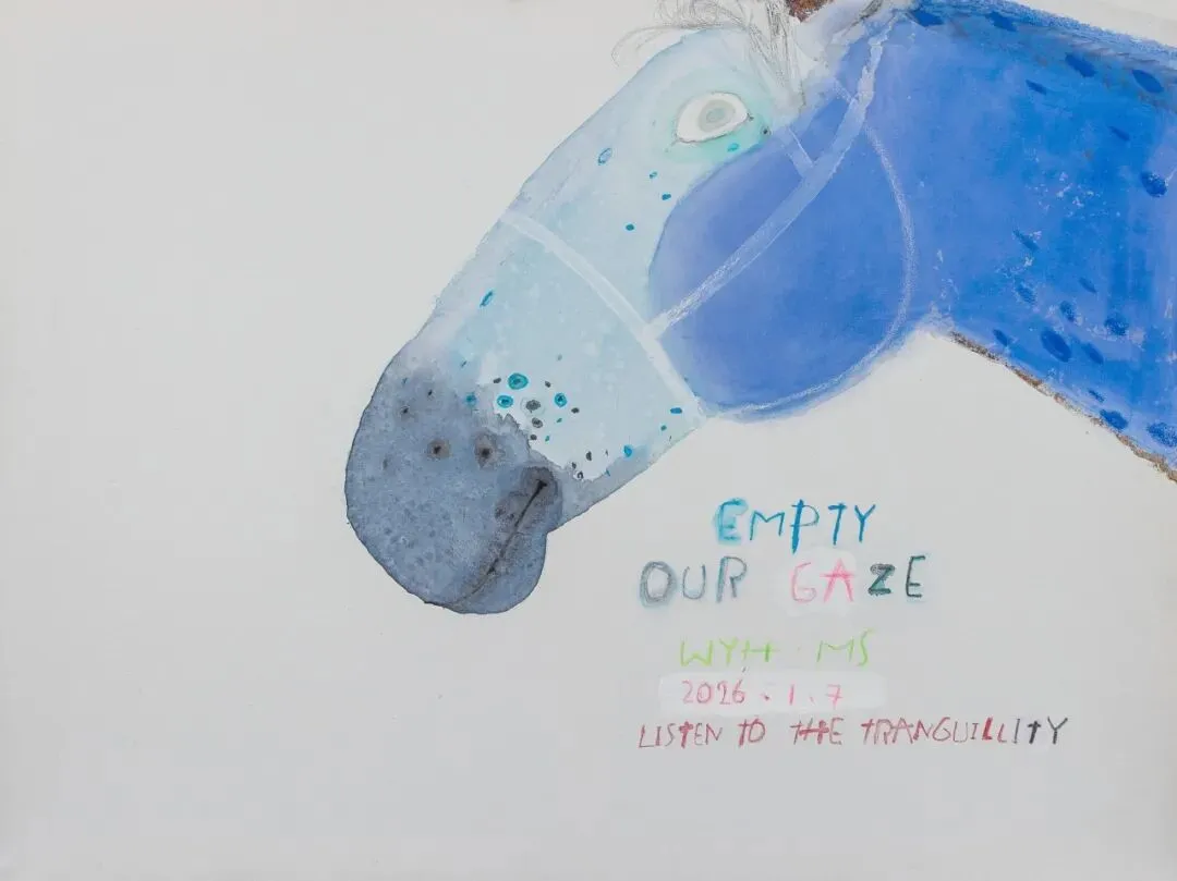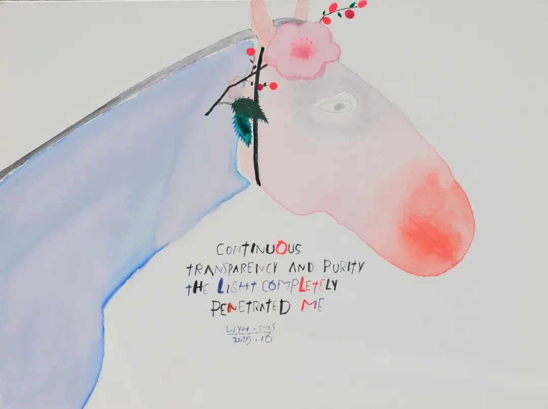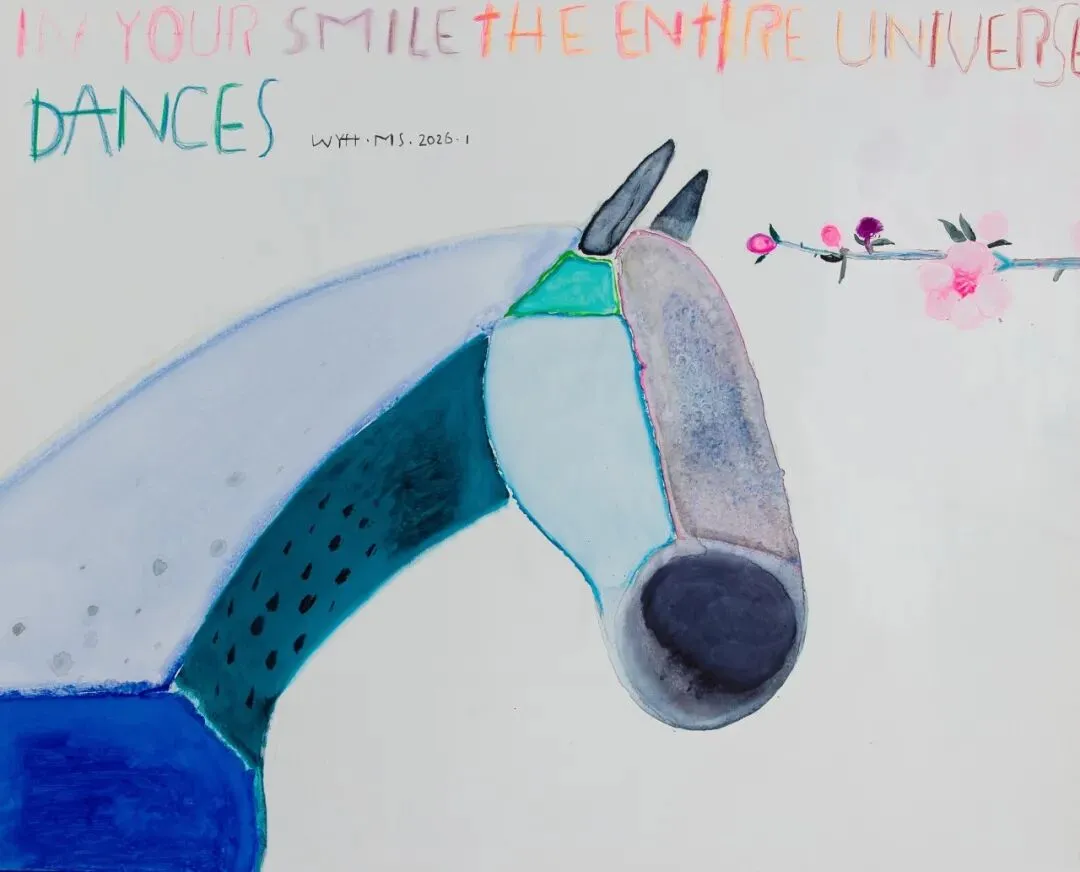 The colors of the "Ma Shang Mei Hao" series paintings remind us of the morning sky. These horses look gentle and pure; the flower branches on the horse's head seemed to carry the morning mist. The graffiti-style sentences like "In Your Smile the Entire Universe Dances","Empty Our Gaze" and "I Saw the Ecstatic Universe" convey the artist's artistic attitude of praising the wonderful pure life. These creations are also a sincere blessing to everyone. May we all have countless wonderful experiences in the New Year.