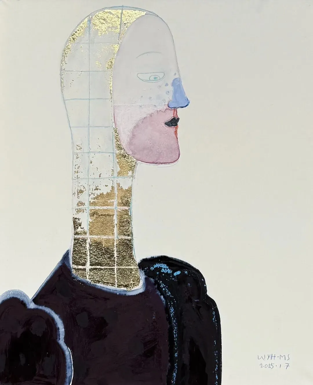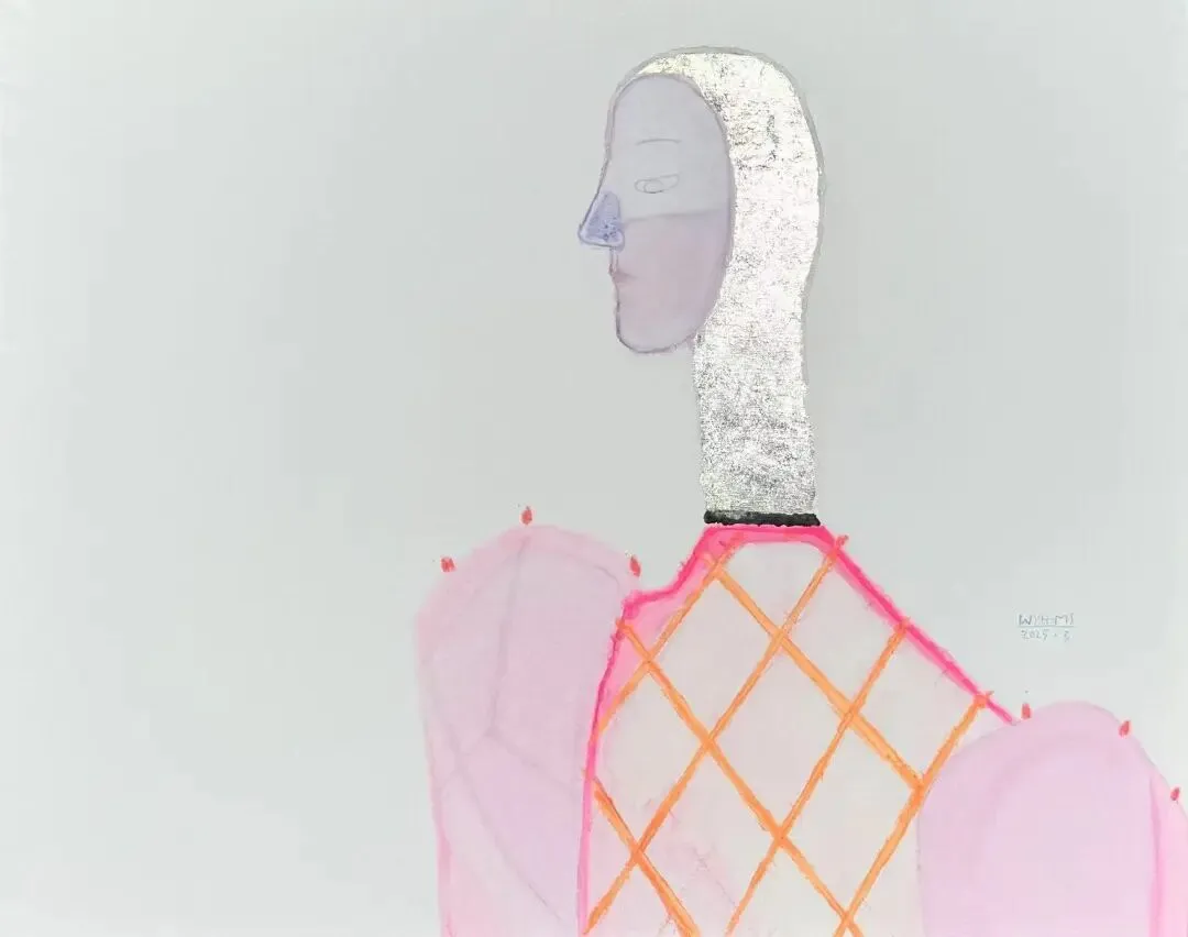 In the "Sacred Silence" series, Wang Yuhua constructs the iconic gender-neutral faces. These faces were usually shown from the side, combining the solemnity of Renaissance portraits and the concision of the abstract geometric structure. The collision of materials such as metal foil and mineral pigments makes the work enjoyable and full of fun, and the huge puff sleeve silhouette also adds a lot of strength to the body in the picture. This interweaving of retro and contemporary elements and the attitude of free exploration corresponds to the concept of Sacred Silence": "Sacred" represents supreme sincerity; "Silence" symbolizes the boundless eternal tranquility. In the state of deep meditation, all boundaries are quietly opened, the artist steps into the inner sacred space, keenly perceives the flowing cycle of life, and carefully records the invisible plays that have just been contemplated in the subconscious.