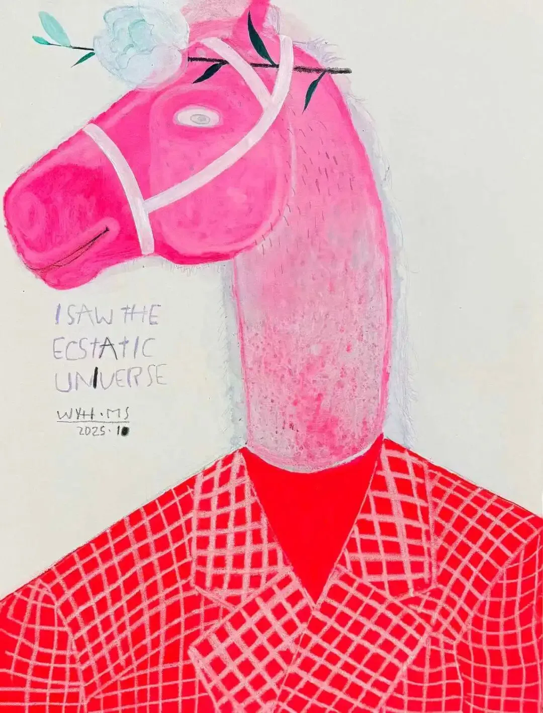 “马上美好”系列,是王玉华作品中色彩最具天空感的。这些马儿看起来温和纯净,精神层面少有的贵气,同时极具代入感,早晨的气息扑面而来。马头上的花枝,似乎还带着清晨的雾气。而英文的涂鸦式语句:“在你的微笑中整个宇宙都在跳舞”“清空你的凝视”“我看到了狂喜的宇宙”,更是传递着艺术家赞美纯然生命的艺术态度。也是对大家的真挚祝福,愿新的一年,我们都能更勇敢地体验生命,感受更多美妙。