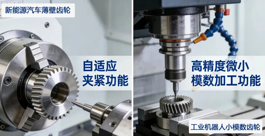 针对新能源汽车、机器人等新兴赛道,设备需具备特定的加工能力。例如,新能源汽车齿轮多为薄壁结构,加工时易变形,需选择具备自适应夹紧功能的设备,可根据工件厚度自动调整夹紧力度;工业机器人齿轮多为小模数齿轮(模数0.1-0.3m),设备需具备高精度的微小模数加工能力,齿轮齿面粗糙度需达到 Ra0.8μm 以下。