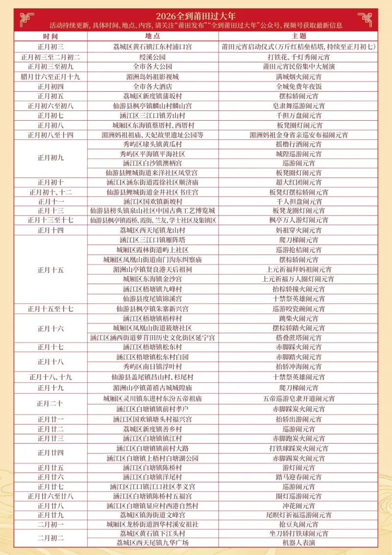 由460多年前抗倭历史演变形成的“正月初四做大岁”“贴白额春联”等独特年俗,让莆田的春节蕴含了更深沉的历史底蕴与人文温度。从农历正月初三至二月初二,莆田元宵持续一月欢腾,万斤红桔垒桔塔、全城免费年夜饭、万人游灯、打铁花、摆棕轿、爬刀梯、妈祖金身巡安布福等特色民俗活动轮番上演,天天有节目、家家齐上阵,精彩纷呈。此外,莆田还拥有湄洲岛、九鲤湖、兴化府历史文化街区、南少林寺、百米木雕《京杭大运河》等优质文旅资源,以及莆田卤面、南日鲍鱼等特色美食,有山珍,有海味,有千年的贡盐,有全世界最大的啤酒厂百威雪津,是“中国鞋都”“中国啤酒制造之城”“中国木雕之城”“黄金珠宝首饰之乡”等多张产业名片的汇集地,能为游客提供“吃住行游购娱”全方位优质体验。