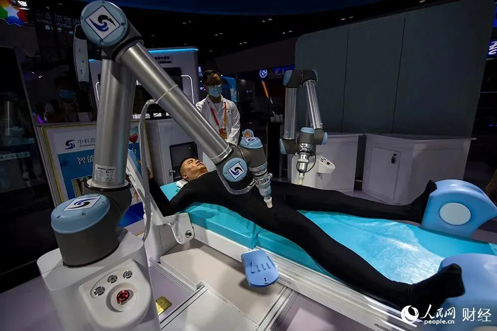 9月4日,在2020年服贸会综合展区,乒乓球机器人正在自动发球。人民网记者 翁奇羽 摄