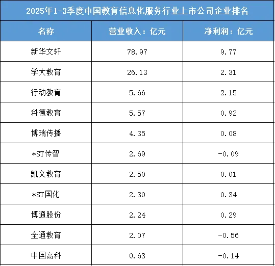 根据东财行业分类,2025年1-3季度中国教育信息化服务行业上市公司企业排名如下:(A股上市公司)
