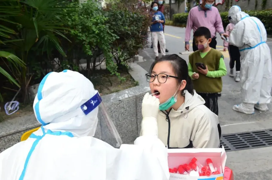 在瑶海一小区核酸采样点,居家上网课的中小学生优先采样、即来即采。