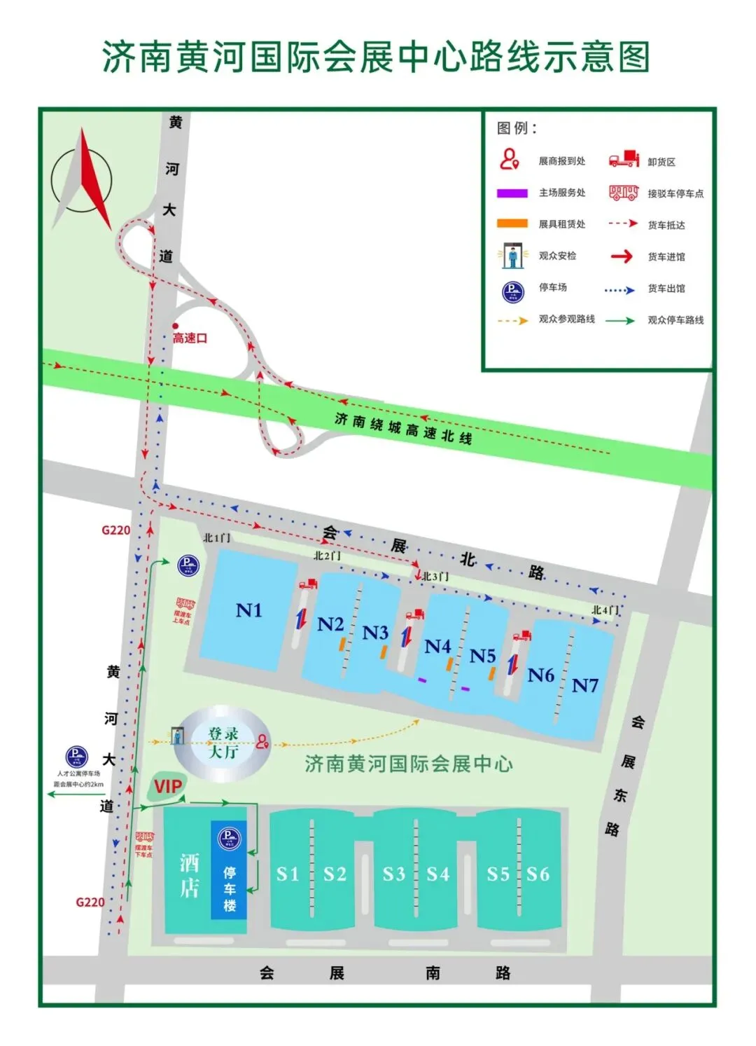 公共交通:“济南长途汽车总站”,步行至“制革街2站”乘坐K901路至“崔寨中心大街(新里锦绣)站”,乘坐展会专用接驳车至“济南黄河国际会展中心”