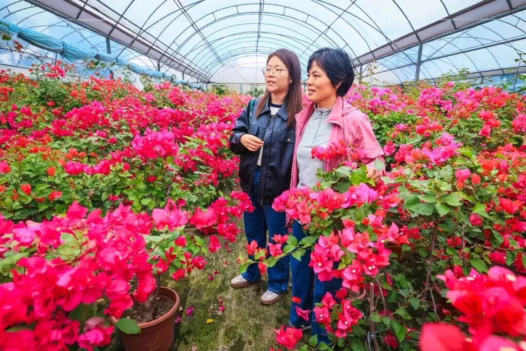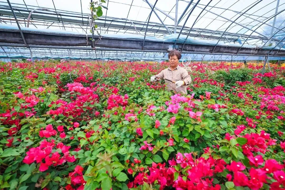 当天,新建的玻璃温室大棚也在紧锣密鼓的收尾中。据介绍,焦家村三角梅花卉产业运营主体为上海大青园林绿化有限公司,该基地专以培育三角梅闻名于华东地区。为进一步提升培育标准与产能,基地于4月启动大棚升级改造工程,并将于11月初完成验收。升级后的现代化大棚将优化温控、灌溉、光照系统,为三角梅生长提供更适宜的环境,确保每一株幼苗都能健康茁壮,提供更稳定、优质的产品。同时,建成后将打造成为三角梅示范区,也将带动周边农户发展庭院经济,助力乡村经济发展。