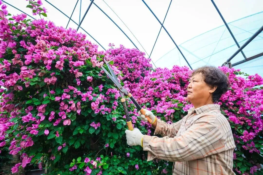 走进花棚,几名花农正在棚间忙着修枝、浇水。“这个红色的是同安红,偏粉色的叫绿叶樱花,都比较受欢迎。”三角梅花卉基地的技术指导余冬丽指着花棚里的三角梅介绍,“基地销售的三角梅,因为植株大小、品种等区别,价格从十几元到上千元不等,周边居民来买,零售也是批发价。”