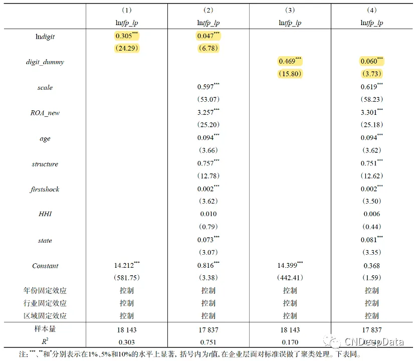 下表报告了基准回归结果,其中列(1)和列(2)以企业数字技术创新规模(lndigit)作为解释变量,列(3)和列(4)以企业数字技术创新虚拟变量(digit_dummy)作为解释变量。从中可以看到,数字技术创新变量的估计系数在1%的水平上显著为正,说明数字技术创新能够促进制造业企业全要素生产率提升。就经济学意义而言,在控制行业、年份与地区固定效应以及其他企业特征的情况下,列(4)结果显示,开展数字技术创新的企业全要素生产率比没有开展数字技术创新的企业要高 0.06%;列(2)结果显示,数字技术创新规模每增加 1%,企业全要素生产率提升 0.047%。无 论在统计意义上还是经济学意义上,数字技术创新都能显著促进制造业企业全要素生产率提升。[1]陈楠,蔡跃洲.数字技术对中国制造业增长速度及质量的影响——基于专利应用分类与行业异质性的实证分析[J].产业经济评论,2021,No.47(06):46-67.[2]黄先海,王瀚迪.数字产品进口、知识存量与企业数字创新[J].浙江大学学报(人文社会科学版),2022,52(02):28-43.以下三种方式三选一即可: