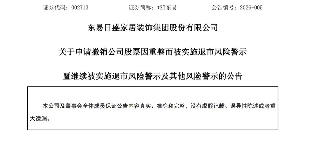 东易日盛家居装饰集团股份有限公司于2026年1月8日晚发布公告,宣布公司重整计划已执行完毕,并据此向深圳证券交易所申请撤销因被法院裁定受理重整而触及的退市风险警示。