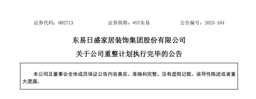 根据公告,东易日盛管理人已出具《重整计划执行情况的监督报告》,北京声驰律师事务所亦出具法律意见书,确认公司重整计划已经执行完毕。