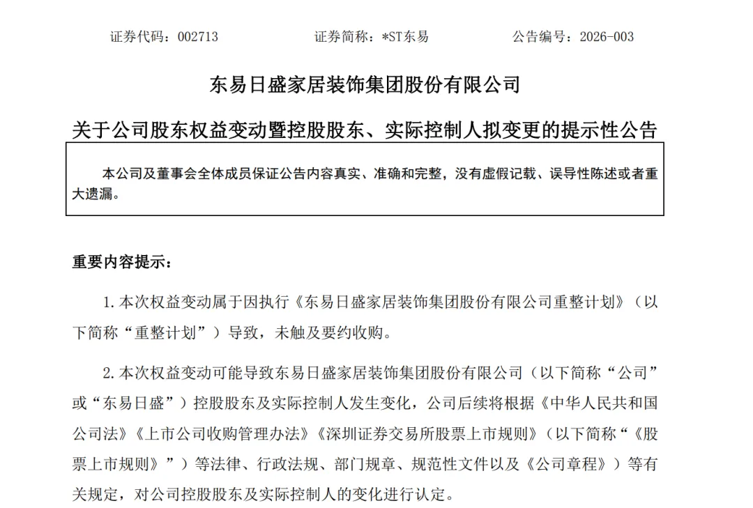 此次权益变动导致原控股股东天津东易天正投资有限公司及其一致行动人持股比例被稀释至约7.72%,而产业投资人北京华著科技有限公司将以15.77%的持股比例成为单一最大股东,公司控股股东及实际控制人可能发生变更。