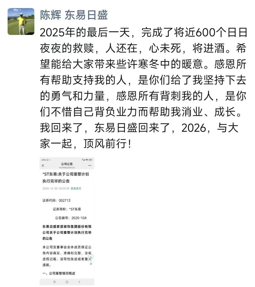 在近年来家装行业多家公司接连“暴雷”的背景下,作为曾经的“家装第一股”,东易日盛及其创始人选择通过规范的司法重整程序积极应对企业经营困境,稳步推进债务重组与战略引资,展现其在危机处理中的定力与担当,堪称业界典范。