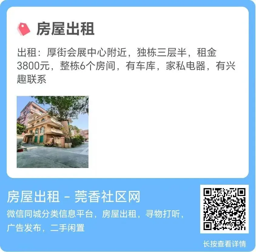 【招租】厚街会展中心附近,独栋三层半,整栋6个房间,有车库,家私电器
