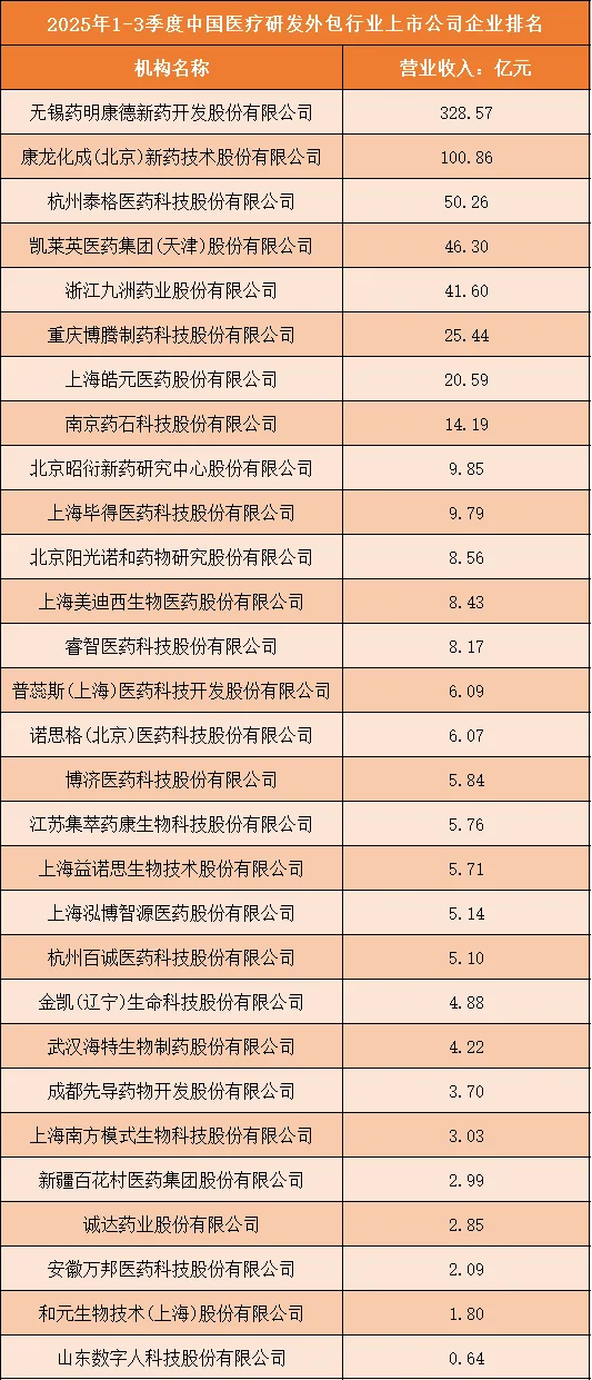 根据申万行业分类,2025年1-3季度中国医疗研发外包行业上市公司按营业收入排名如下:(A股上市公司)
