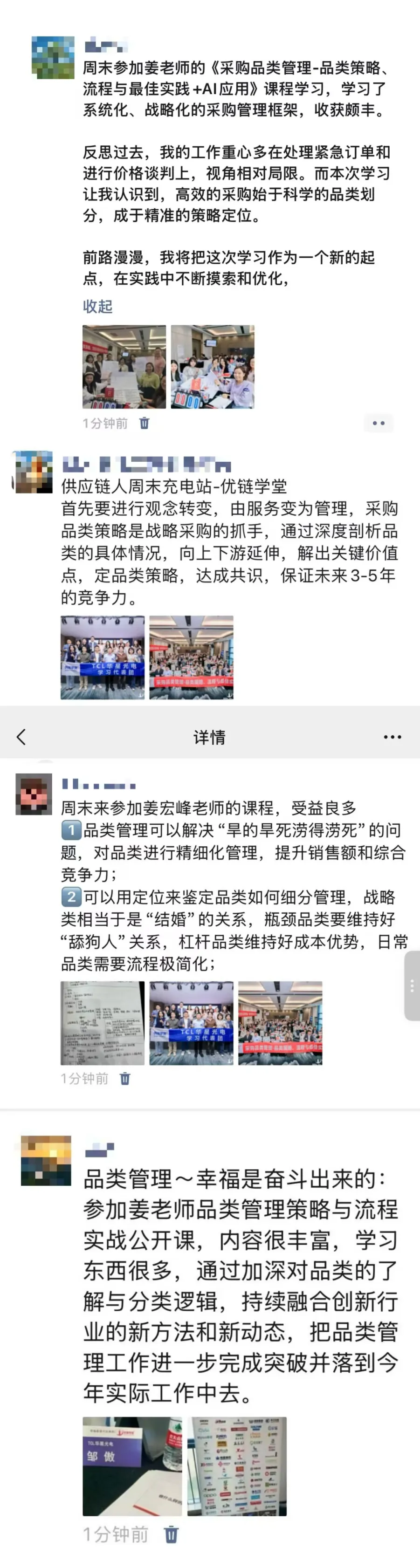 姜老师通过持续不断地深入企业辅导,落地提炼出来一套行之有效的采购品类管理体系、策略和方法,辅导企业每年做品类报告、品类策略大赛、品类管理案例集,深度融入企业的组织基因中。不仅帮企业提升了采购团队的专业度,解决了跨部门的协同问题,更帮企业实现了精准降本增效的难题。