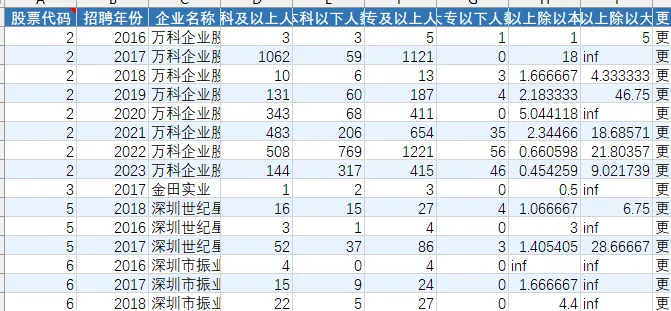 股票代码 | 招聘年份 | 企业名称 | 本科及以上人数 | 本科以下人数 | 大专及以上人数 | 大专以下人数 | 本科及以上除以本科以下 | 大专及以上除以大专以下 |