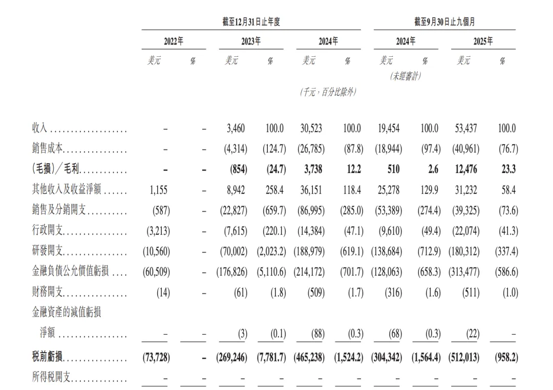 由于模型智能水平及推理效率的提升,MiniMax的核心盈利能力也在不断增强。公司毛利率从2023年的-24.7%,快速转正到2024年的12.2%,2025年前9个月继续提升至23.3%。