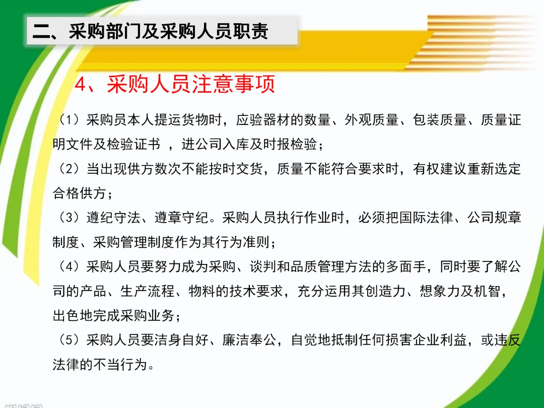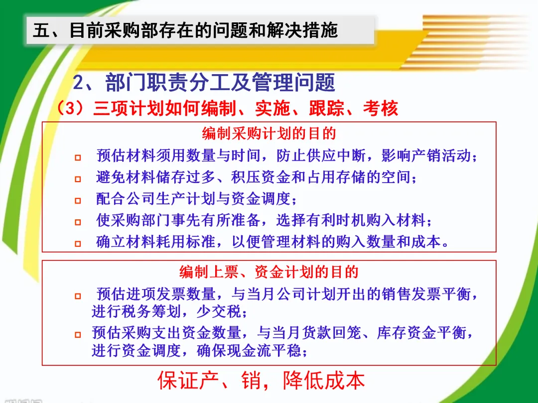 当前企业采购典型问题包括职责定位模糊、跨部门沟通低效、绩效评价缺失等。解决方案需结合短期管控与长期规划:短期明确采购计划与供应商考核标准,中期建立采购与生产、销售的数据共享机制,长期将采购纳入企业战略决策体系。
