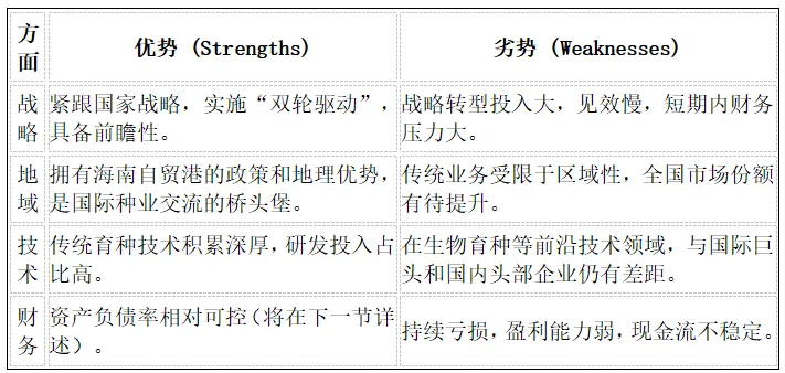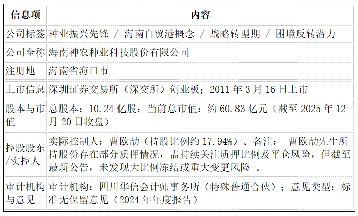 一家立足海南、深耕传统农作物种业的上市公司,正积极通过“农作物+水产”双轮驱动战略,寻求在国家种业振兴和海南自贸港政策红利下实现业务和财务的深度转型,其核心特征是政策敏感性高、战略转型决心强,但短期内仍面临持续盈利的挑战和高估值的风险。