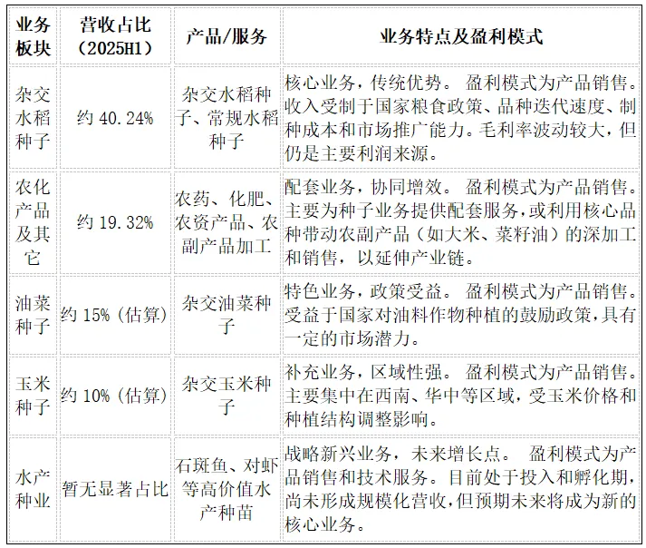 公司主营业务涵盖优质油菜、水稻、玉米等主要农作物种子的选育、繁育、制种、销售和技术服务,以及依托核心种子品种带动的粮油及农副产品加工业务 。