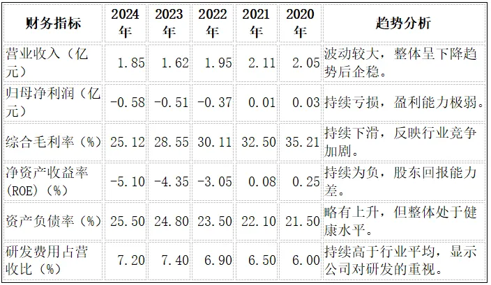 营收及净利润复合增长率: 近五年(2020-2024年)营收复合增长率为-2.5%,归母净利润复合增长率为负值(因基数小且持续亏损,计算意义不大)。这表明公司在传统业务上缺乏增长动力,处于停滞甚至衰退状态。