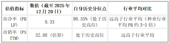 神农种业的估值水平(PB、PS)远高于自身历史和行业平均水平。这表明其当前股价并非基于传统的财务指标,而是完全由市场对“种业振兴”和“海南自贸港”两大政策概念的强烈预期所驱动。高估值反映了市场对其战略转型成功和未来盈利爆发的高溢价。