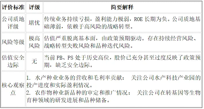 “双轮驱动”的风险与机遇: 布局水产种业是高风险高回报的战略。如果水产种业能在海南自贸港的政策支持下快速形成规模化和技术壁垒,将彻底改变公司的盈利结构。反之,如果投入巨大但回报周期过长,将进一步拖累公司本已脆弱的财务状况。