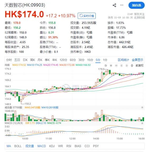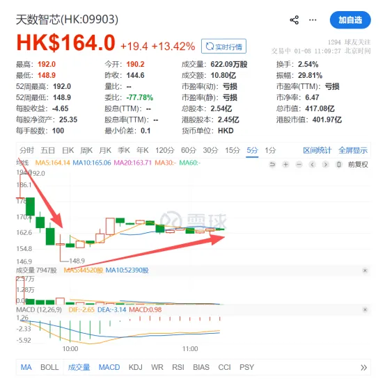 到了1月9日,开盘后天数智芯先是下探到150.2港元的低位,然后再度一路震荡回升。