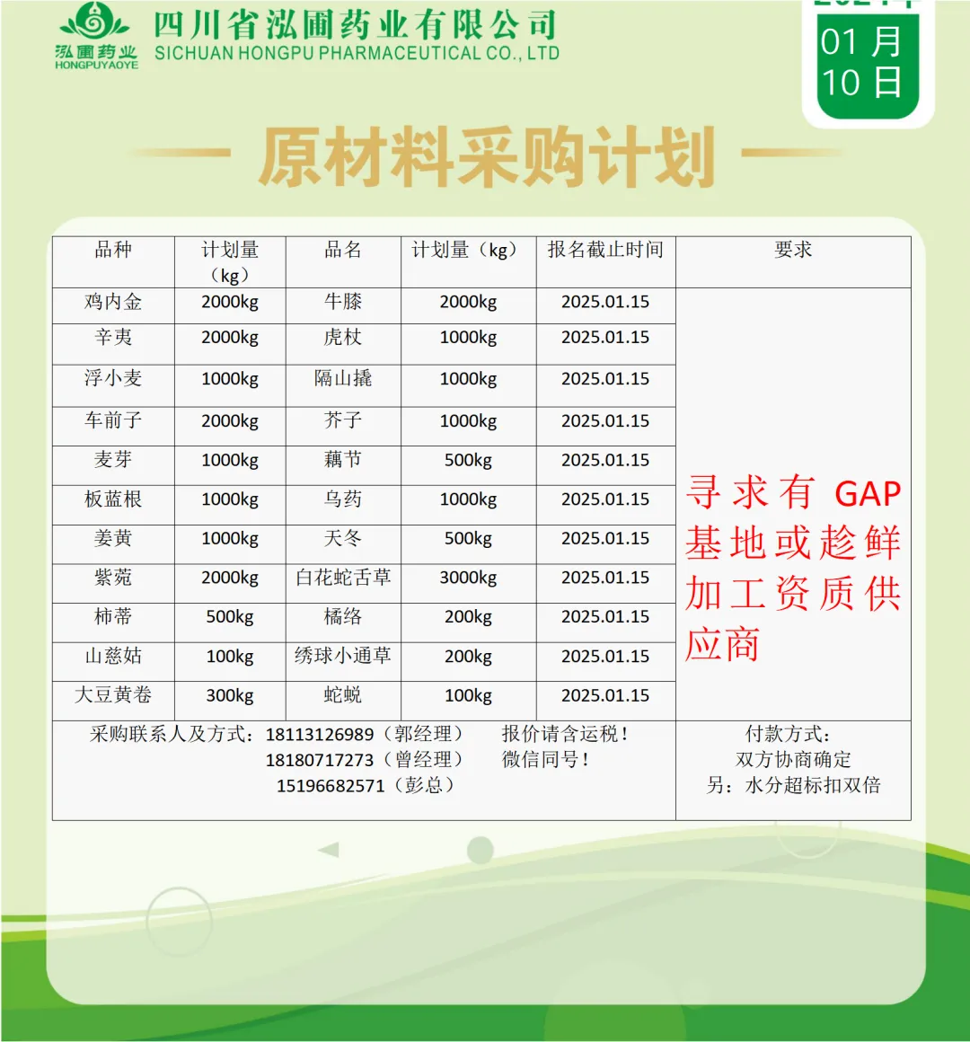 四川省泓圃药业有限公司采购22个品种:鸡内金、辛夷、浮小麦、车前子、麦芽、板蓝根、姜黄、紫菀、柿蒂、山慈菇、大豆黄卷、牛膝、虎杖、隔山撬、芥子、藕节、乌药、天冬、白花蛇舌草、橘络、绣球小通草、蛇蜕