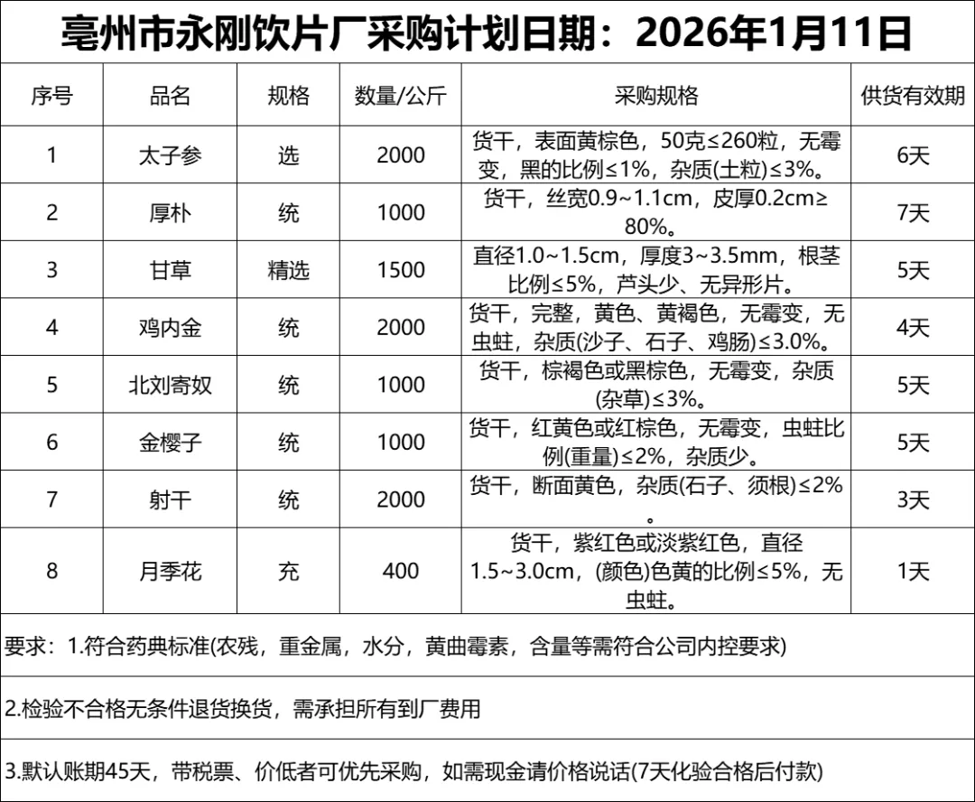 亳州市永刚饮片厂有限公司招标采购8个品种 免费查看联系方式 药材计划2026.1.11