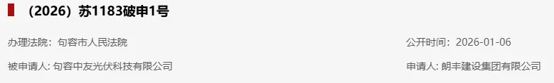 数字新能源DataBM.com获悉,朗丰建设集团有限公司向江苏镇江句容市人民法院提出对句容中友光伏科技有限公司进行破产申请,公开时间为2026年1月6日,案号为(2026)苏1183破申1号。