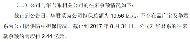 对此,海润光伏方面承认有债权债务关系,并以公告形式披露华君系为其担保总额为19.56亿元,但否认了孟广宝的“暗中担保”情况。