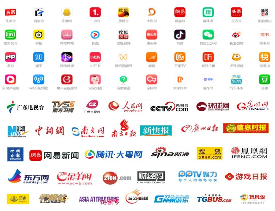 南方日报、广东广播电视台、羊城晚报、广州日报、南方都市报、新快报、搜狐、新浪、网易、腾讯、凤凰网、今日头条、优酷视频、爱奇艺视频、中新视频、南方网、中华网、环球文化网、今日中国、中国日报网、中国文化产业网、中国文化旅游网、文旅中国、文化旅游联盟网、文旅快报网、中国文旅网、中国网、中国演艺、亚洲演艺网、舞台灯光网、中国旅游新闻网、游戏日报、国际游戏报、谷歌游戏网、中国乐游网、游乐网、中国电竞网、电玩巴士、中国企业报/中国企业网、中国贸易报/中国贸易新闻网、国际在线、光明网、环球网、人民网、央广网、人民日报海外网、新华在线、中宏网、中新网、中国商报网、中国报道网、中国财经网、人民日报《人民周刊》网、人民政协报/网、中国经济时报/中国经济新闻网、中国经济导报/网、中国经营报/网、中国产业经济信息网、中国财经时报网、中国商务网、中国消费日报网、CCTV-中视文化传播网、中国周刊网、中国晨报网、新华报业网、深圳热线、每日深圳、深圳经济网、深港在线、港澳在线、广东财经网、广东经济网、南方科技网、东莞经济网、大湾区新闻网、亚洲新闻网、实况网、佛山热线、珠海生活网、珠海在线、中山都市网、中山在线、中山视野、湖南日报华声在线、凤凰网湖南、海峡网、东快网、千龙网、一点资讯、和讯网、新闻快讯网、中国新媒体信息网、中国企业新闻网、中国经营网、中国数字新闻网、华夏晚报、江南时报、东南网、慧聪网、深圳导报、167旅游网、中国旅游新闻网 、江西晨报网、海南网、广西华声晨报、南宁新闻网、贵州网、黔南热线、云南经济日报、云南经济新闻网、中国云南网、重庆实况网(重庆时报)、重庆新闻网、多彩重庆网、四川新闻网、四川热线、贵州热线、昆明网华西都市网、湖北新闻网、湖北热线、三峡新闻网、浙江热线网、浙江都市报、浙江广播网、上海东方网、青海网络广播电视台、青海新闻网、西宁新闻网、西藏新闻网、新疆青年网、兰州新闻网、西安日报、西安新闻网、华商网/西安网、山东新闻网、齐鲁晚报网、东北新闻网、东北网、北方网、河北都市网、河南网、河南热线、内蒙古热线、北京青年网、游戏头条、中国游乐网、中国动漫产业网、游乐界、游艺风、游乐志、灯都商圈、神州游乐、百汇信息报、电玩娱乐、一线商情、CCTY新儿童国际、游乐快报、瞳神文化传媒、文旅邦、迈点、《地接社资讯》等。