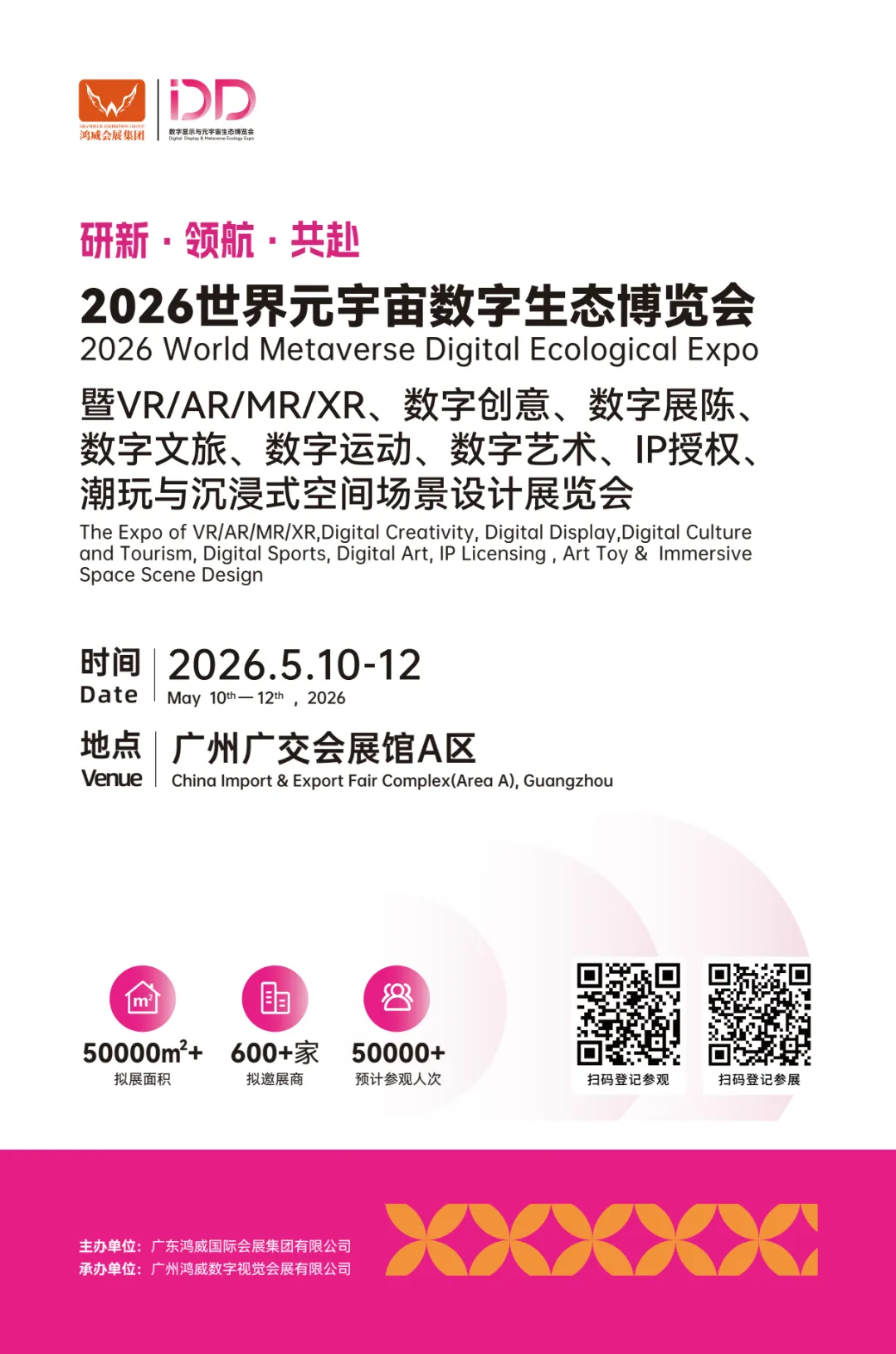2026世界元字宙数字生态博览会暨VR/AR/MR/XR、数字创意、数字展陈、数字文旅、数字运动、数字艺术、IP授权、潮玩与沉浸式空间场景设计展览会由广东鸿威国际会展集团有限公司主办,广州鸿威数字视觉会展有限公司承 办。将于2026年5月10-12日,在广州·中国进出口商品交易会展馆A区举办,